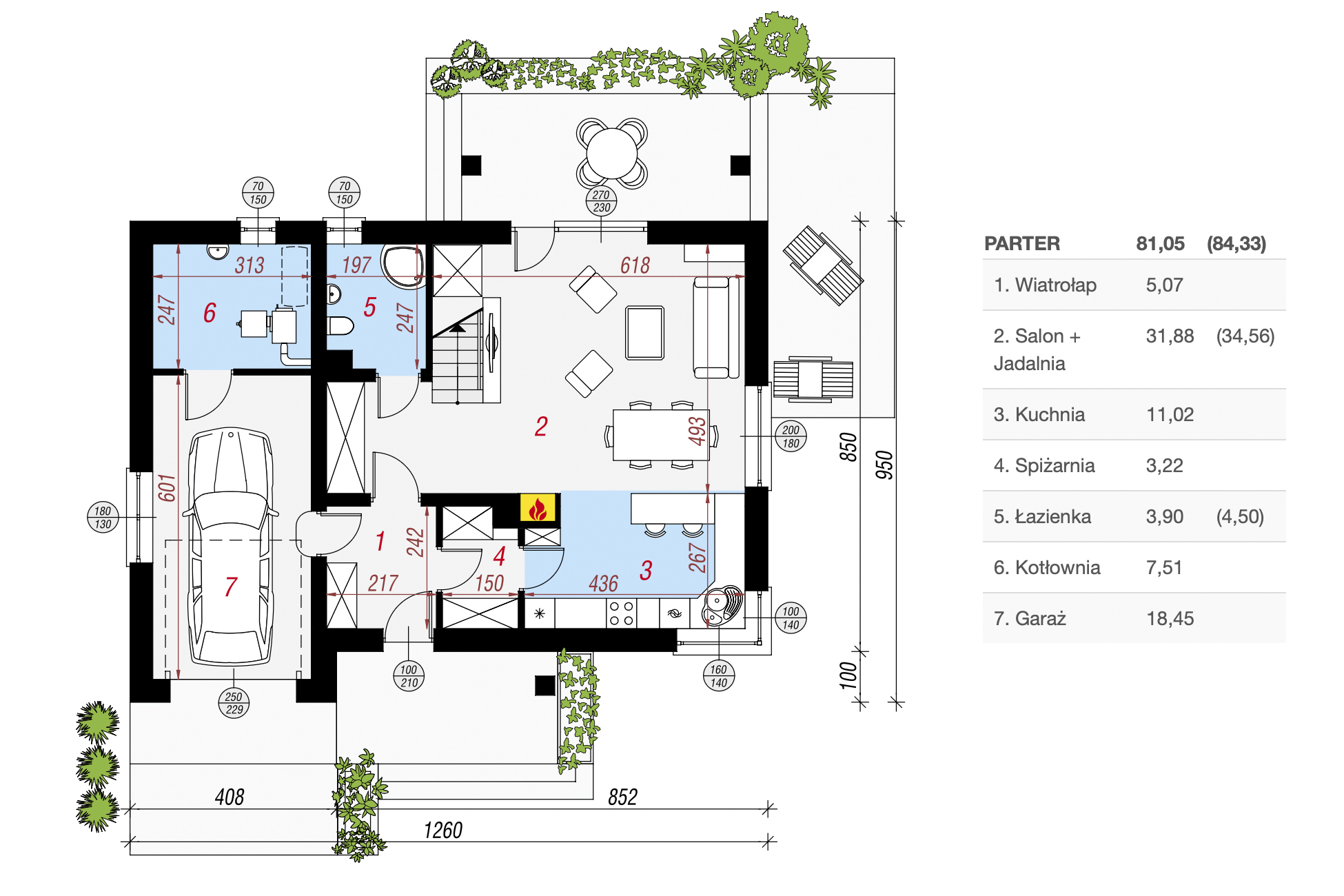Parter o powierzchni 81,05 m² (84,33 m²):